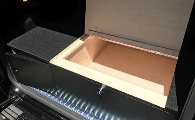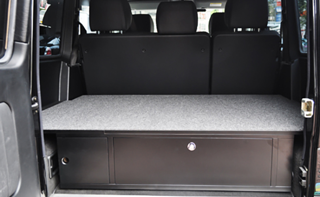 for W463A G-Class- タイヤハウジングの車内の張り出しを簡単な組み立てでフラットにするカーゴBOXです。下のBOX部分には走行中に聞くことが無いようにロックが付いています。また天板を跳ね上げられるように改良し、後部ドアを大きく開けない状態でも内部の物の出し入れが可能となりました。純正CDチェンジャーの取り出しも可能になっており、キャンパスやゴルフ、レジャーにおすすめなアイテムです。